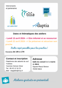 L’association Instance de Coordination Sud Yvelines met en place un cycle d’ateliers à destination des Aidants de Personnes Agées en perte d’autonomie. Ces ateliers se tiendront les lundis 15 et 22 avril 2024 à la salle du Conseil de la Mairie de Méré, de 14 à 17h. (Deux ateliers de 1h30 par jour, la participation à tous les ateliers n’est pas obligatoire)