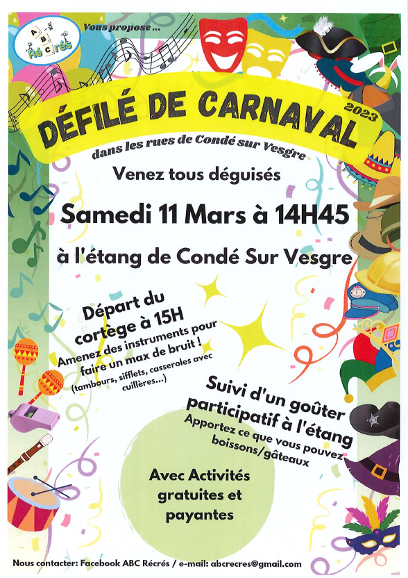 Le Samedi 11 Mars à 14h45, défilé de Carnaval dans les rues de Condé Sur Vesgre. Départ à 15h de l'étang. Venez toutes et tous déguisés avec des instruments pour faire du bruit. Le défilé sera suivi d'un goûter participatif à l'étang. Apportez ce que vous pouvez, gâteaux, biscuits, boissons.... L'organisateur ABCRECRES, recherche des bénévoles […]